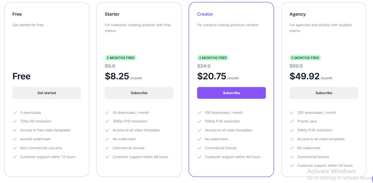 - Creator Plan (~$20.75/mo): 100 downloads/month, access to all premium templates, and priority support.