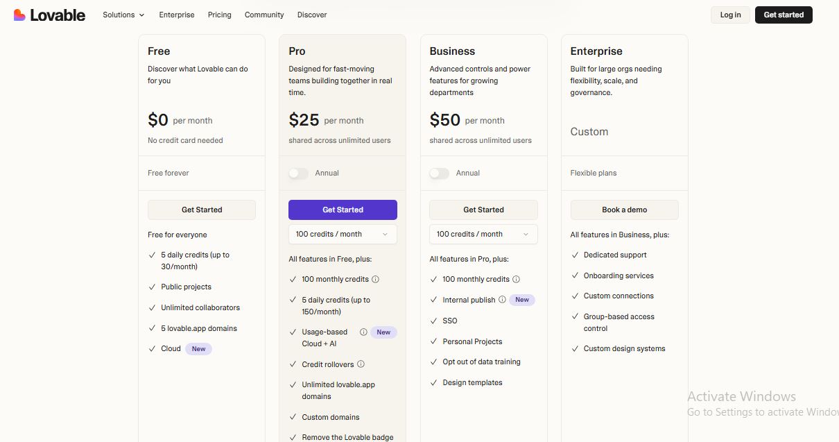 • Free Plan ($0): 5 daily credits (up to 30/month). Great for testing the platform; however, projects are public and include a Lovable badge.