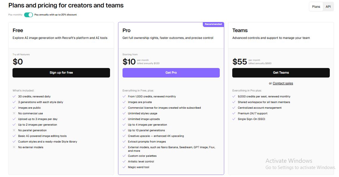 - Pro Plan (~$10/mo billed annually): 1,000 monthly credits, private generations, full commercial license, and 4K creative upscaling.