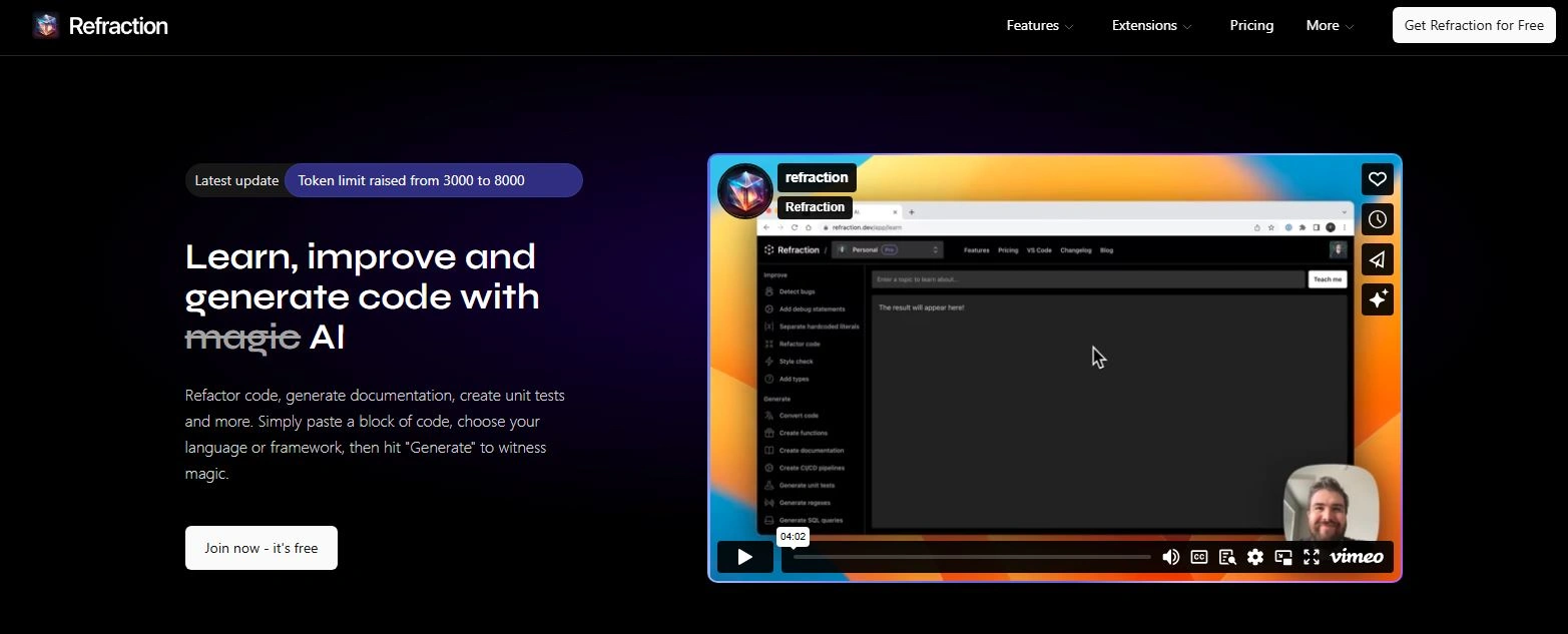 Refraction AI: Revolutionizing Software Development Refraction AI is an advanced tool designed to simplify and optimize software development processes. By leveraging artificial intelligence, it automates tasks like code generation, unit testing, code refactoring, and documentation creation. Supporting over 56 programming languages, Refraction AI empowers developers to focus on creativity and problem-solving while reducing repetitive work